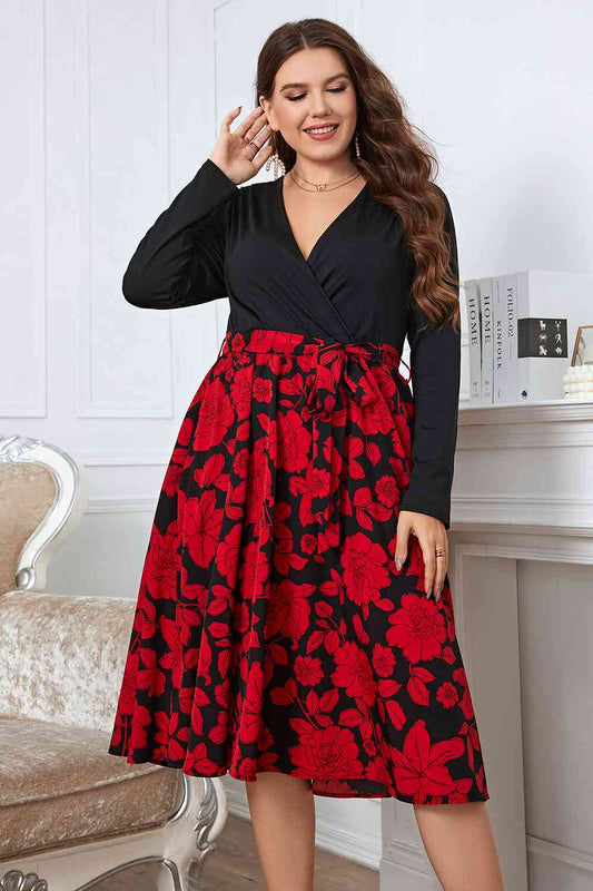 Plus Size Floral Surplice Neck Long Sleeve Dress