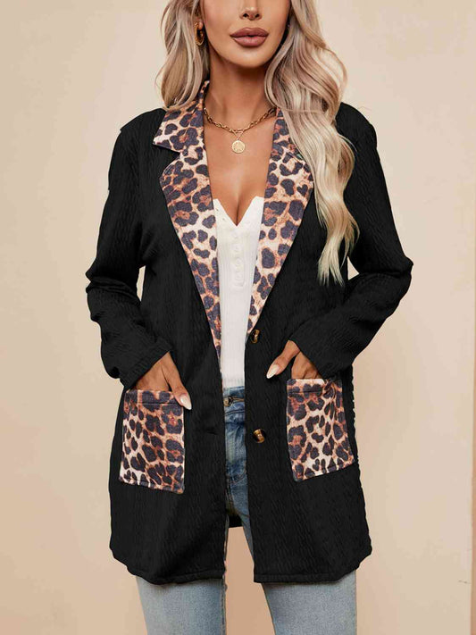 Leopard Buttoned Lapel Collar Blazer with Pockets