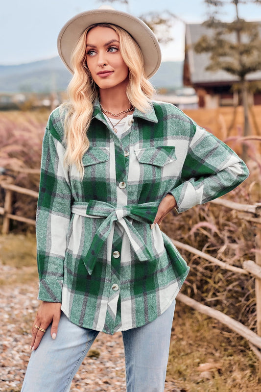 Plaid Collared Neck Bow Front Long Sleeve Jacket