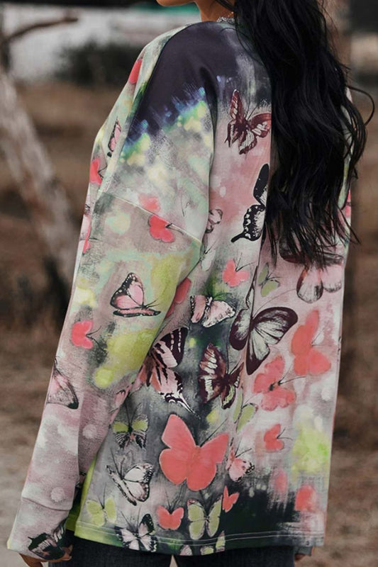 Butterflies Print Round Neck Zipper Front Blouse