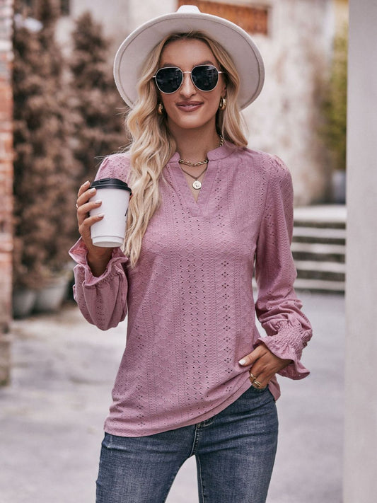 Double Take Eyelet Notched Neck Flounce Sleeve Blouse