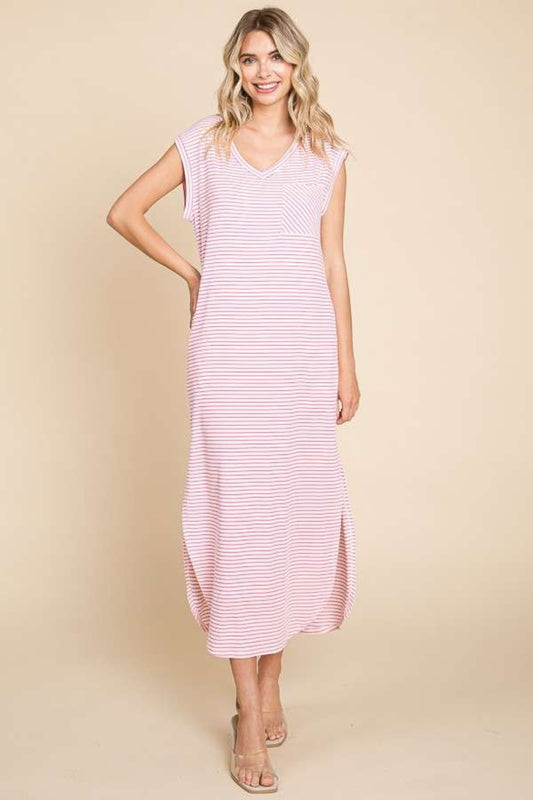 Culture Code Full Size Striped V-Neck Slit Dress with Pockets