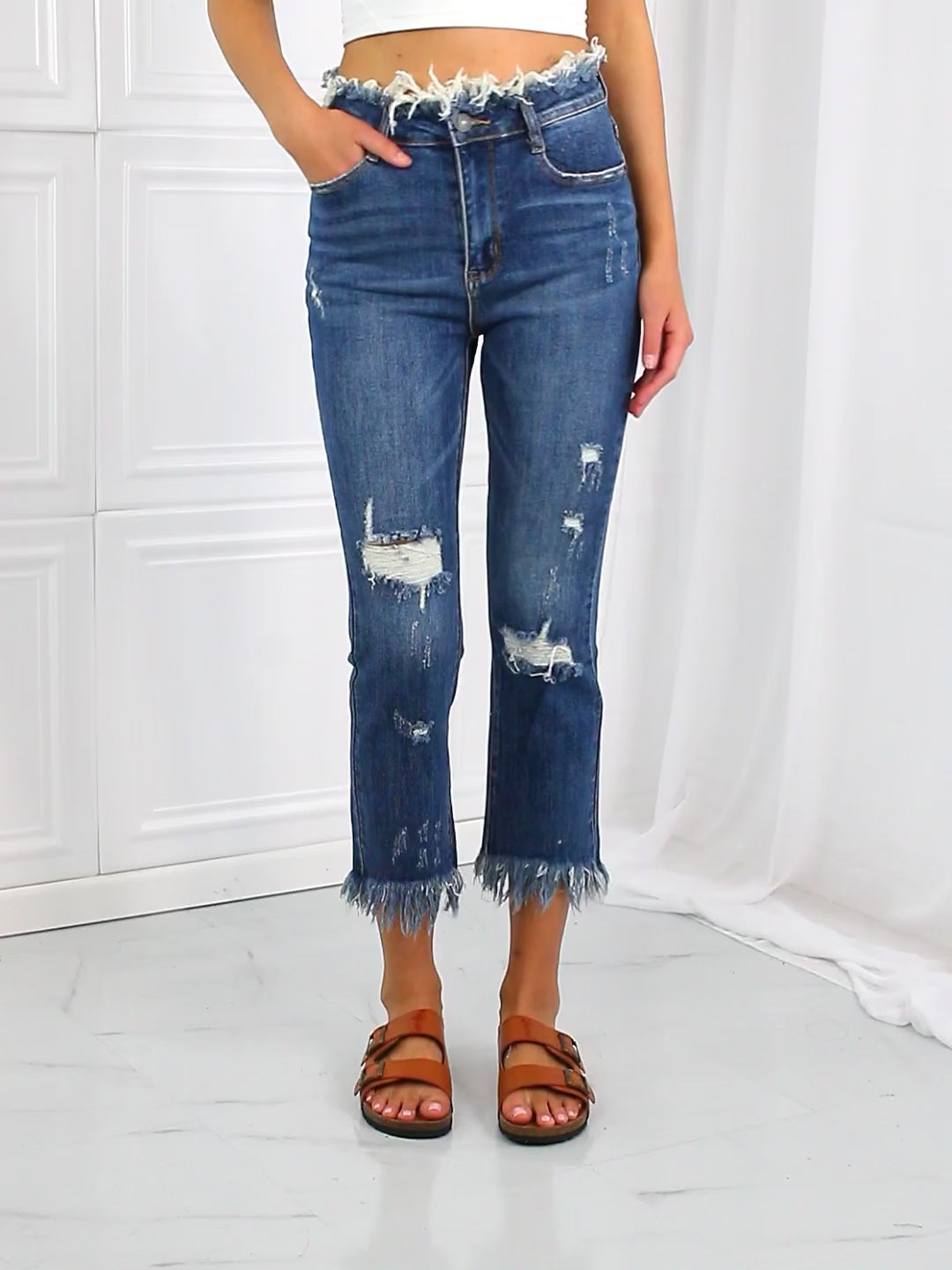 These straight leg jeans really amplify the "undone" look that you're trying to achieve. Not only do these jeans have distressing details throughout the body of the jeans and at the hem, but also at the waist! To emphasize that unique feature, wear the jeans with a crop top.